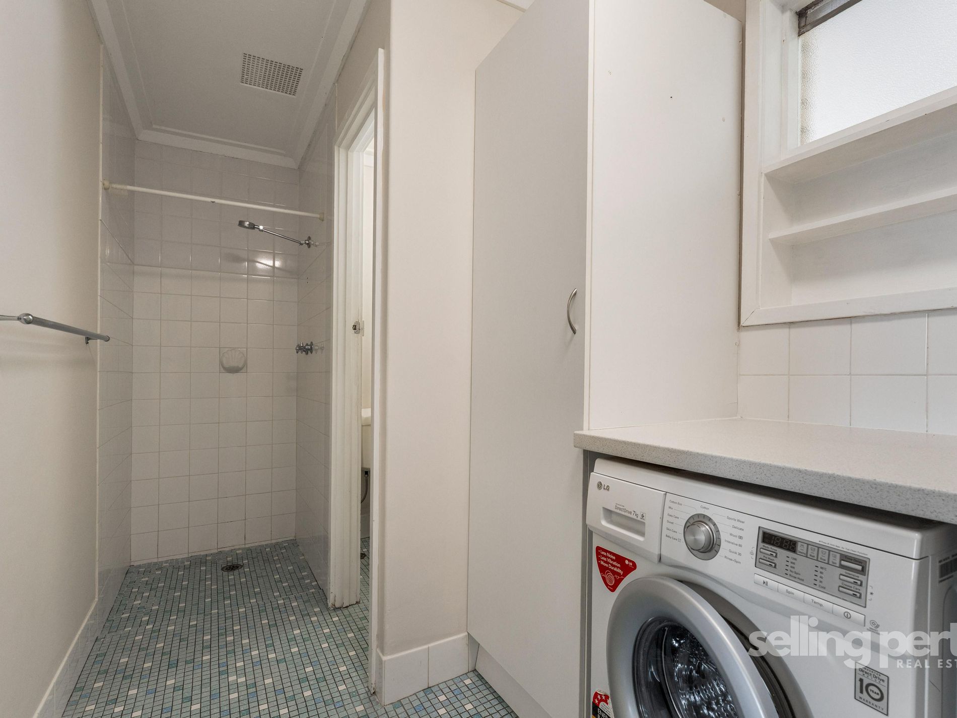 • Bathroom: Tiled shower recess, vanity, WC and a convenient laundry setup with a washing machine