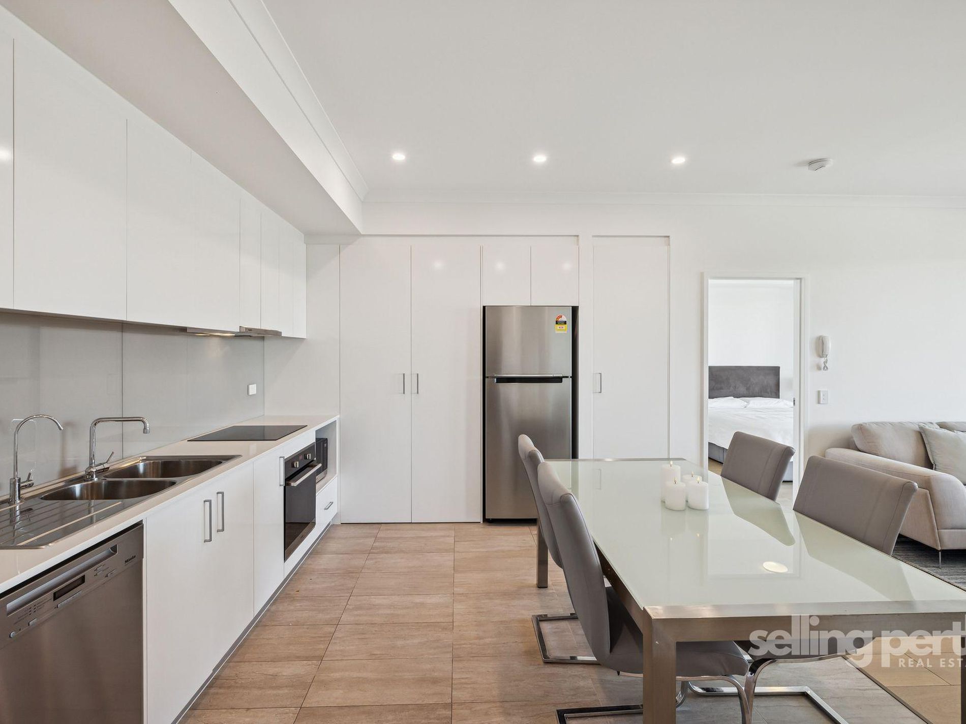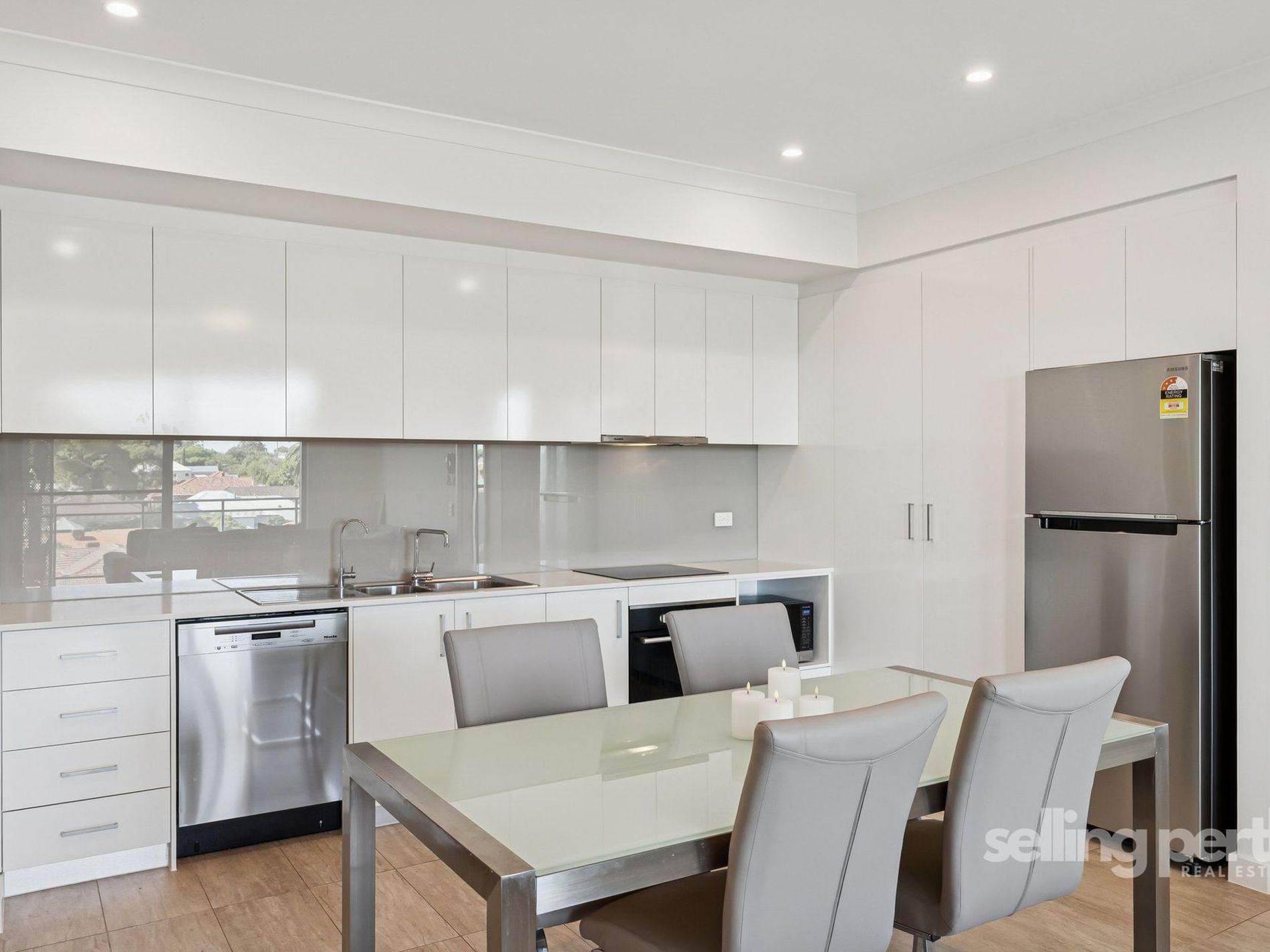 • The sleek kitchen features classic white gloss cabinetry, stone benchtops, ample cupboard space, glass splashback, quality stainless steel appliances, including a Miele dishwasher
